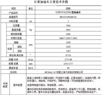程力油化公司生產(chǎn)的江淮加油車車主要配置: