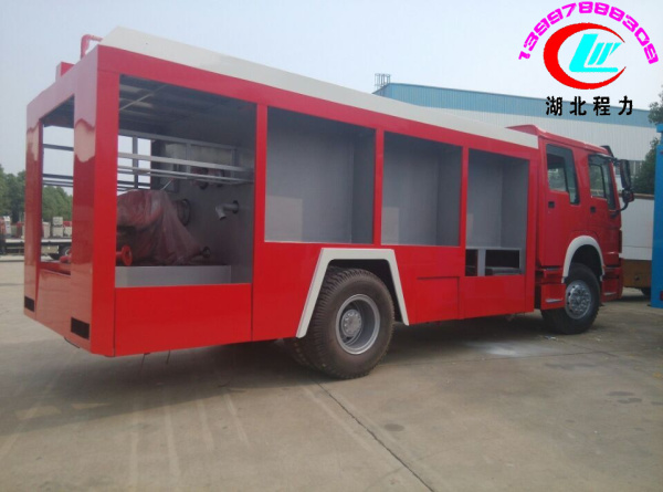 1、消防車(chē)為方形罐體,采用鋼身骨架,根據(jù)功能需要分配多個(gè)清楚儲(chǔ)物廂,鋁合金卷簾門(mén)。