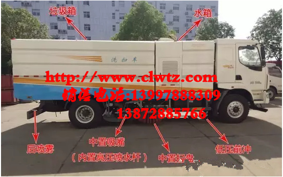 洗掃車結(jié)合了掃路車和高壓清洗車的功能,一般標(biāo)配兩個中置掃刷,中置超寬吸嘴(內(nèi)置高壓噴水桿)。洗掃車在作業(yè)時由高壓噴水桿噴出高壓水流,可沖起路面頑固附著物,由吸嘴連同水和垃圾一起吸進(jìn)垃圾箱。由于洗掃車在作業(yè)過程中耗水量較大,所以水箱比較大,因此洗掃車都由軸距在3800以上底盤改裝而成。